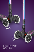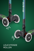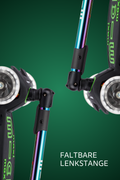 Das Maxi Micro Deluxe Foldable Neochrome LED ist ein Kickboard für Kinder im Schulalter, das für den täglichen Einsatz auf Schulwegen und in der Freizeit konzipiert ist. Der auffällige Neochrome-Look und die während der Fahrt leuchtenden LED-Rollen erhöhen die Sichtbarkeit ohne den Einsatz von Batterien.