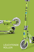 Leuchtende LED-Räder: Sowohl die Vorder- als auch die Hinterräder sind mit langlebigen LED-Leuchten ausgestattet, die sich durch Bewegungsenergie (Induktion) aktivieren. Kein Batteriewechsel notwendig – mehr Sichtbarkeit, mehr Sicherheit, mehr Spaß.